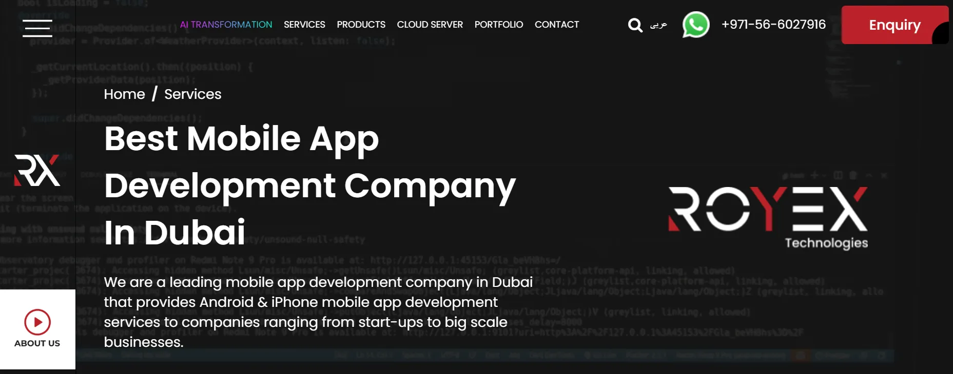 Core Services: Native iOS and Android apps, Flutter, React Native, AR/VR experiences, IoT platforms, enterprise mobility, and UI/UX design.