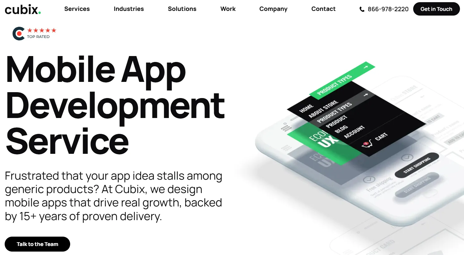 Core Services: Custom iOS and Android development, AI-powered app features, eCommerce platforms, web applications, and UI/UX design.