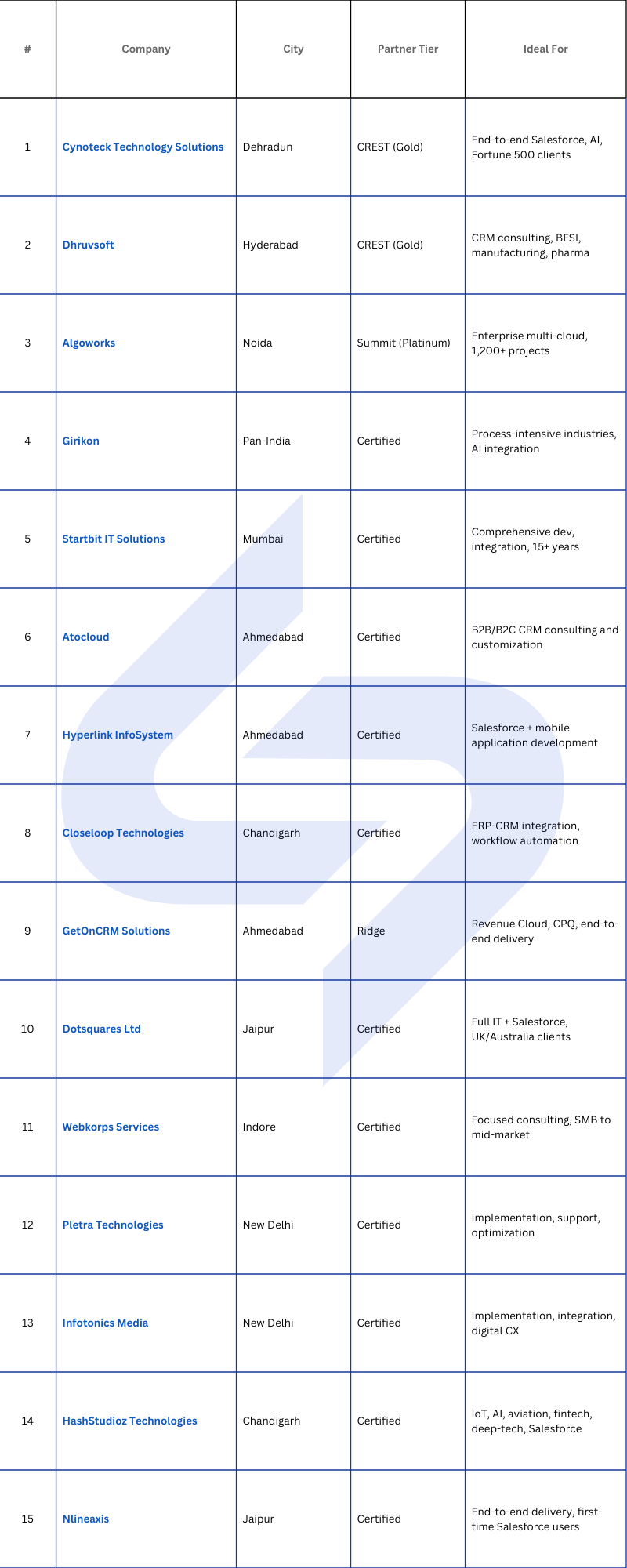 Use this table as a quick reference to match your business needs, city preferences, or partner tier requirements to the right Salesforce consulting company in India.