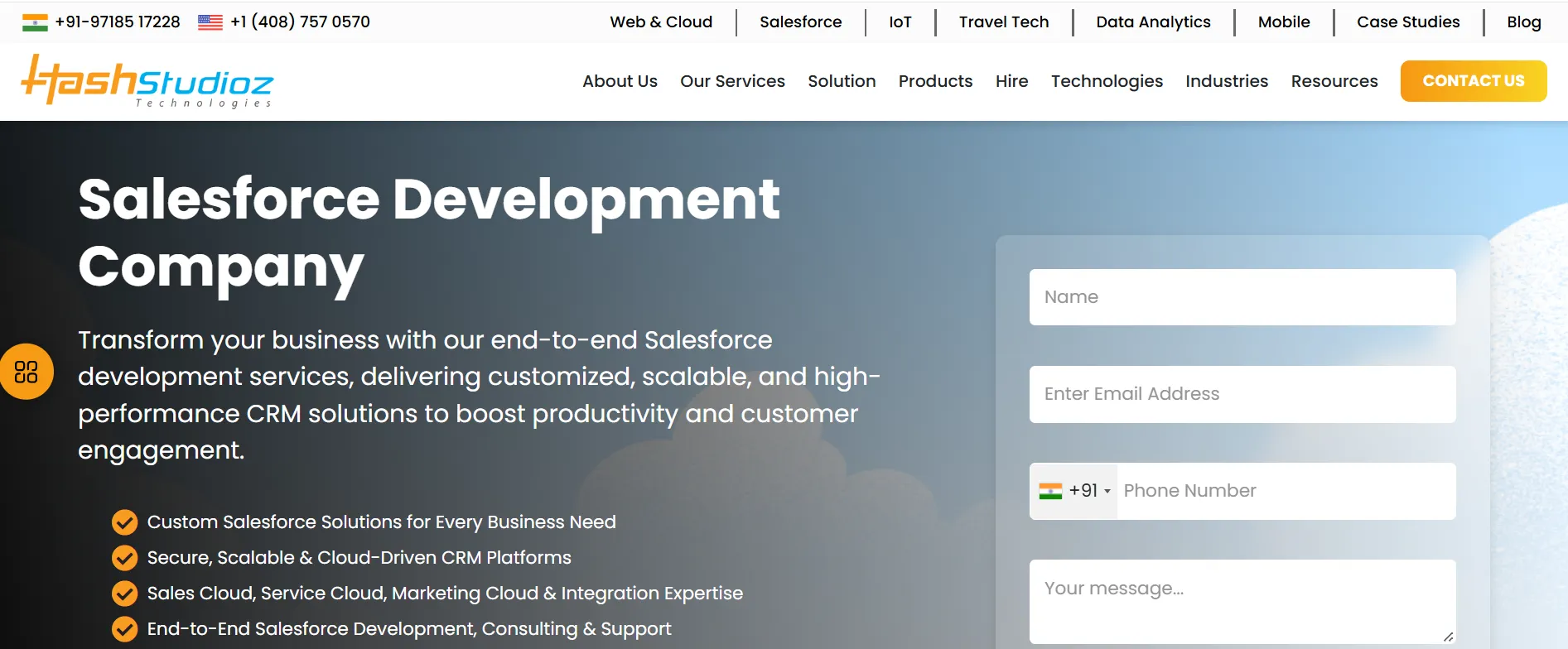 HashStudioz Technologies operates at the intersection of Salesforce CRM and deep-technology disciplines — IoT, AI, advanced analytics, and industry-specific platforms — that most Salesforce consultancies treat as out-of-scope. Their October 2025 acquisition of Maxify Digital, a Salesforce firm whose clients included Air India and SpiceJet, gave them immediate standing in India’s aviation and travel technology sectors. For Indian businesses in IoT-connected manufacturing, banking, and fintech that need Salesforce connected to intelligent autonomous systems or industry-specific platforms, HashStudioz brings cross-domain architecture experience that standard Salesforce firms cannot provide.